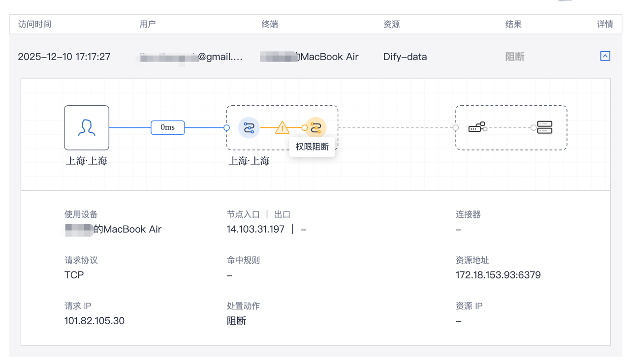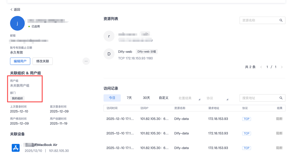 能够在用户详情中查看到能够访问的资源的列表,和访问阻断记录