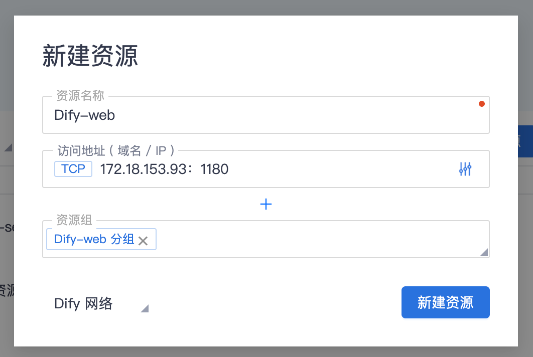 其中选择 Dify 网络,访问地址输入 dify 服务的真实 ip + 端口,请求协议选择 TCP。