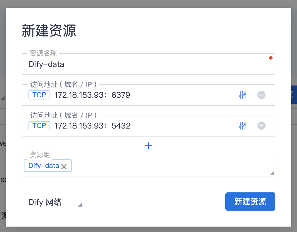 其中选择 Dify 网络,访问地址输入 dify redis 和 pg 服务的真实 ip + 端口,请求协议选择 TCP。