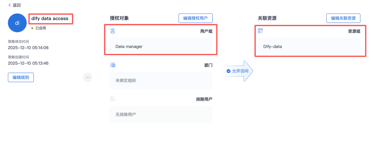 仅允许用户组 data manager 下的用户访问资源组 dify-data 的所有应用