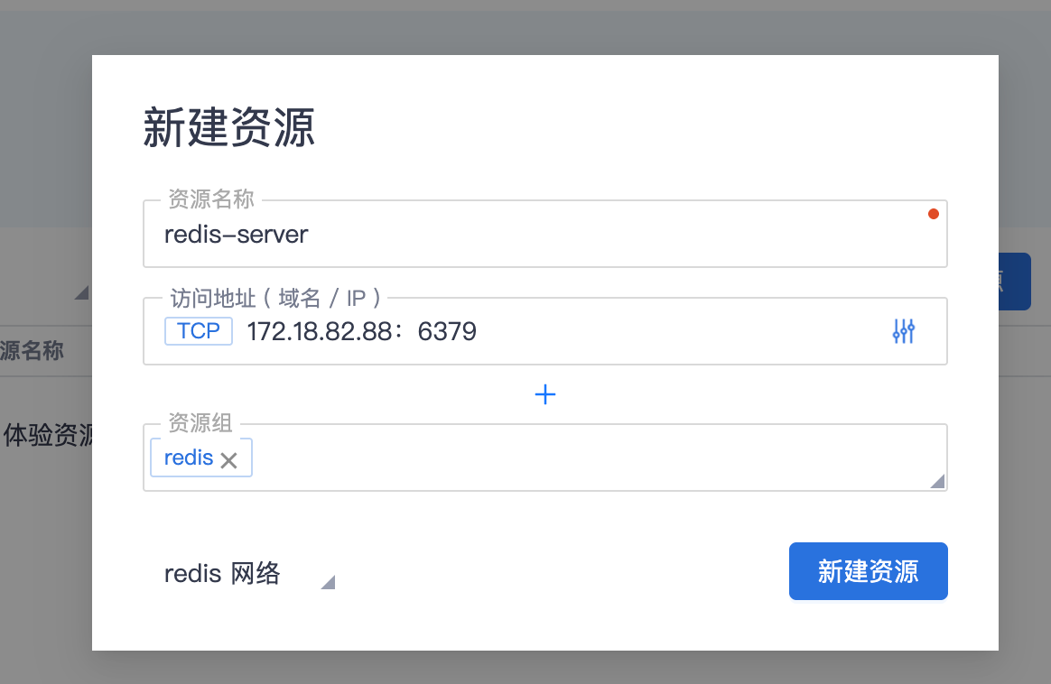 其中选择 redis 网络,访问地址输入 redis 服务的真实 ip + 端口,请求协议选择 TCP。
